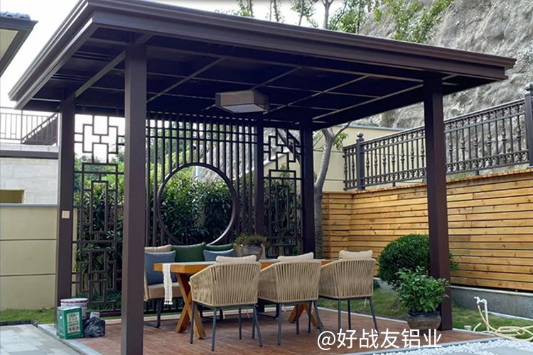 由退伍军人创办,是一家集图纸设计,生产制造,现场施工到售后服务于一体的专业化公司。主要产品有铝合金新中式凉亭、铝合金四角凉亭、铝合金长廊、铝合金葡萄架、铝合金六角凉亭、铝合金琉璃瓦长廊、铝合金车棚、琉璃瓦四角凉亭、琉璃瓦六角凉亭、电动翻转百叶凉亭。